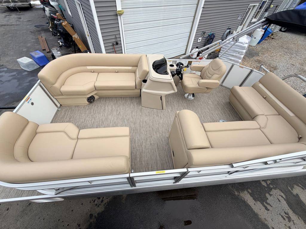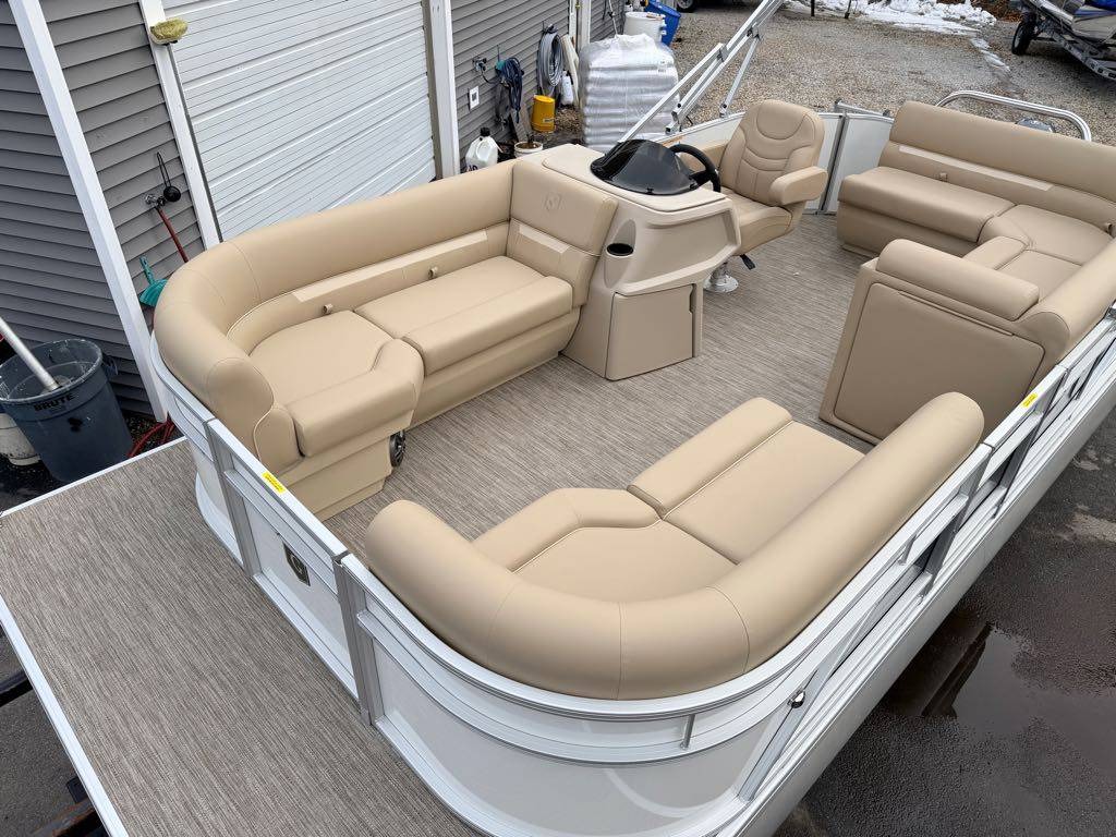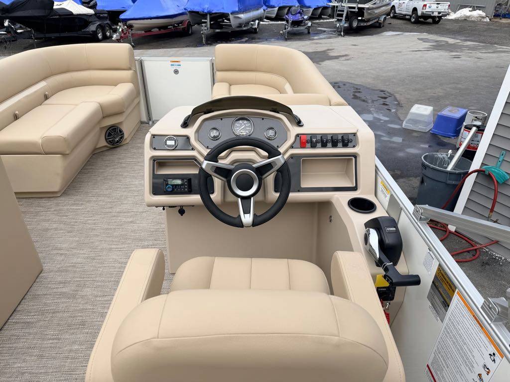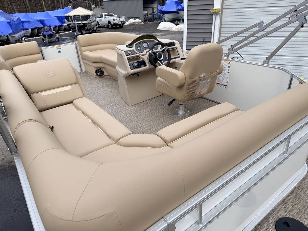 The sleek aluminum hull and stylish Pearl White accents give this pontoon boat a modern and sophisticated look that is sure to impress. As you relax in the comfortable cockpit seating, you can enjoy your favorite tunes on the Clarion Bluetooth® audio system, creating the perfect soundtrack for your day on the water.